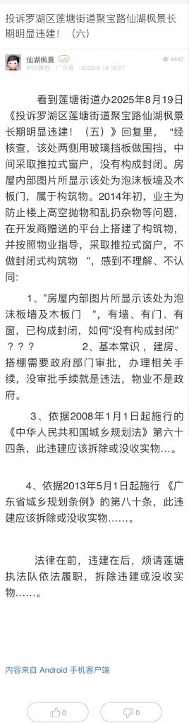 10. 帖文《投訴羅湖區(qū)蓮塘街道聚寶路仙湖楓景長(zhǎng)期明顯違建!(六)》