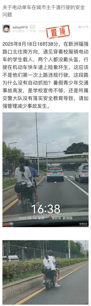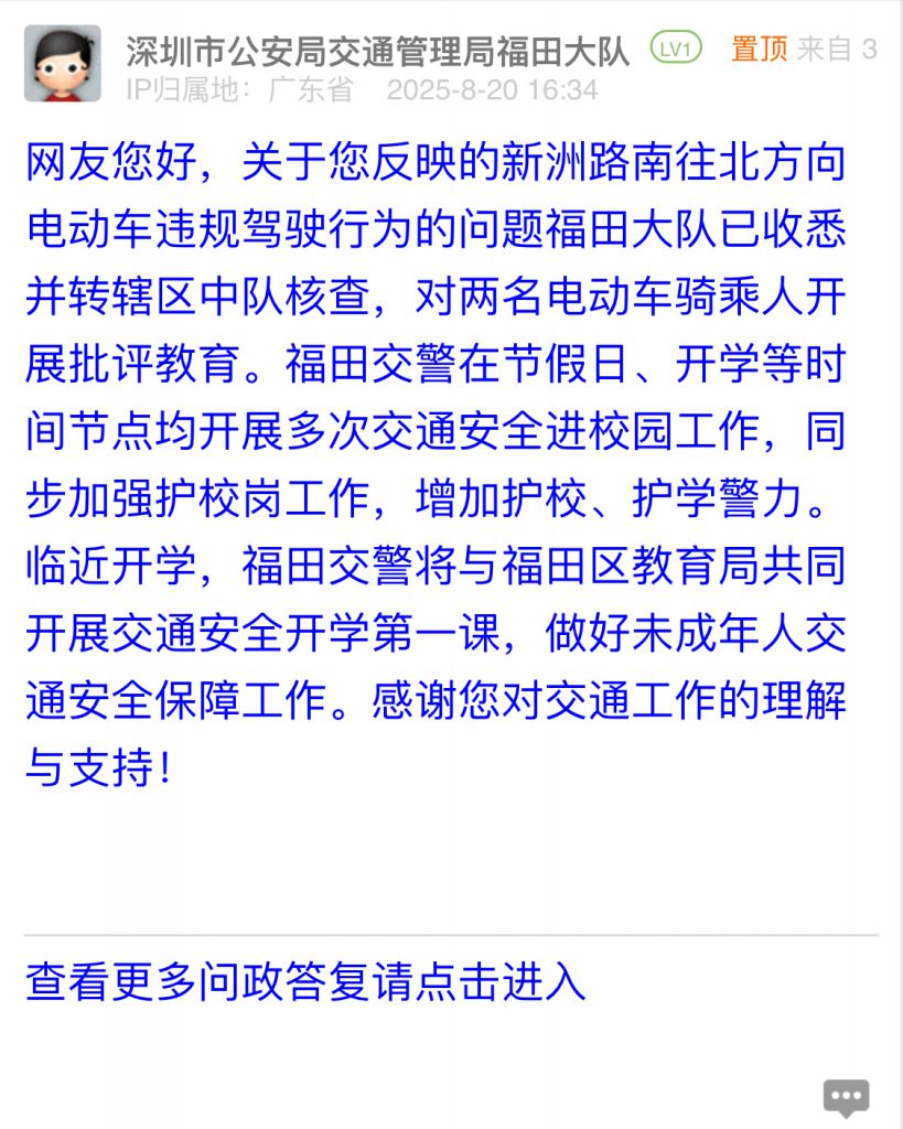 網(wǎng)友您好,關(guān)于您反映的新洲路南往北方向電動(dòng)車違規(guī)駕駛行為的問(wèn)題福田大隊(duì)已收悉并轉(zhuǎn)轄區(qū)中隊(duì)核查,對(duì)兩名電動(dòng)車騎乘人開展批評(píng)教育。福田交警在節(jié)假日、開學(xué)等時(shí)間節(jié)點(diǎn)均開展多次交通安全進(jìn)校園工作,同步加強(qiáng)護(hù)校崗工作,增加護(hù)校、護(hù)學(xué)警力。臨近開學(xué),福田交警將與福田區(qū)教育局共同開展交通安全開學(xué)第一課,做好未成年人交通安全保障工作。感謝您對(duì)交通工作的理解與支持!