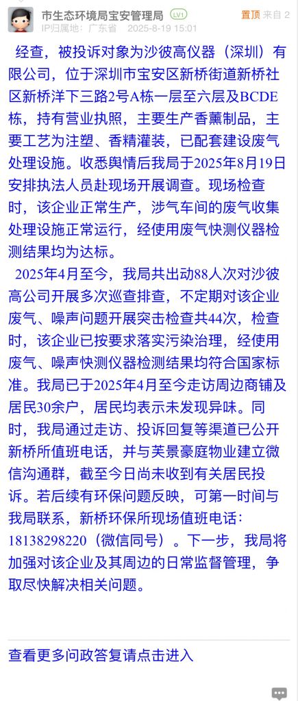 經(jīng)查,被投訴對(duì)象為沙彼高儀器(深圳)有限公司,位于深圳市寶安區(qū)新橋街道新橋社區(qū)新橋洋下三路2號(hào)A棟一層至六層及BCDE棟,持有營(yíng)業(yè)執(zhí)照,主要生產(chǎn)香薰制品,主要工藝為注塑、香精灌裝,已配套建設(shè)廢氣處理設(shè)施。收悉輿情后我局于2025年8月19日安排執(zhí)法人員赴現(xiàn)場(chǎng)開展調(diào)查?,F(xiàn)場(chǎng)檢查時(shí),該企業(yè)正常生產(chǎn),涉氣車間的廢氣收集處理設(shè)施正常運(yùn)行,經(jīng)使用廢氣快測(cè)儀器檢測(cè)結(jié)果均為達(dá)標(biāo)。