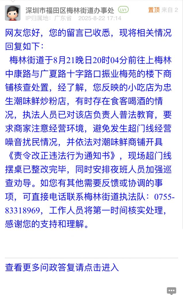 梅林街道于8月21晚日20時(shí)04分前往上梅林中康路與廣夏路十字路口振業(yè)梅苑的樓下商鋪核查處置,經(jīng)了解,您反映的小吃店為忠生潮味鮮炒粉店,有時(shí)存在食客喝酒的情況,執(zhí)法人員已對(duì)該店負(fù)責(zé)人普法教育,要求商家注意經(jīng)營(yíng)環(huán)境,避免發(fā)生超門線經(jīng)營(yíng)噪音擾民情況,并依法對(duì)潮味鮮商鋪開具《責(zé)令改正違法行為通知書》,現(xiàn)場(chǎng)超門線擺桌已整改完畢,同時(shí)安排夜班人員加強(qiáng)巡查勸導(dǎo)。如您有其他需要反饋或協(xié)調(diào)的事項(xiàng),可直接電話聯(lián)系梅林街道執(zhí)法隊(duì):0755-83318969,工作人員將第一時(shí)間核實(shí)處理,感謝您的支持和理解。
