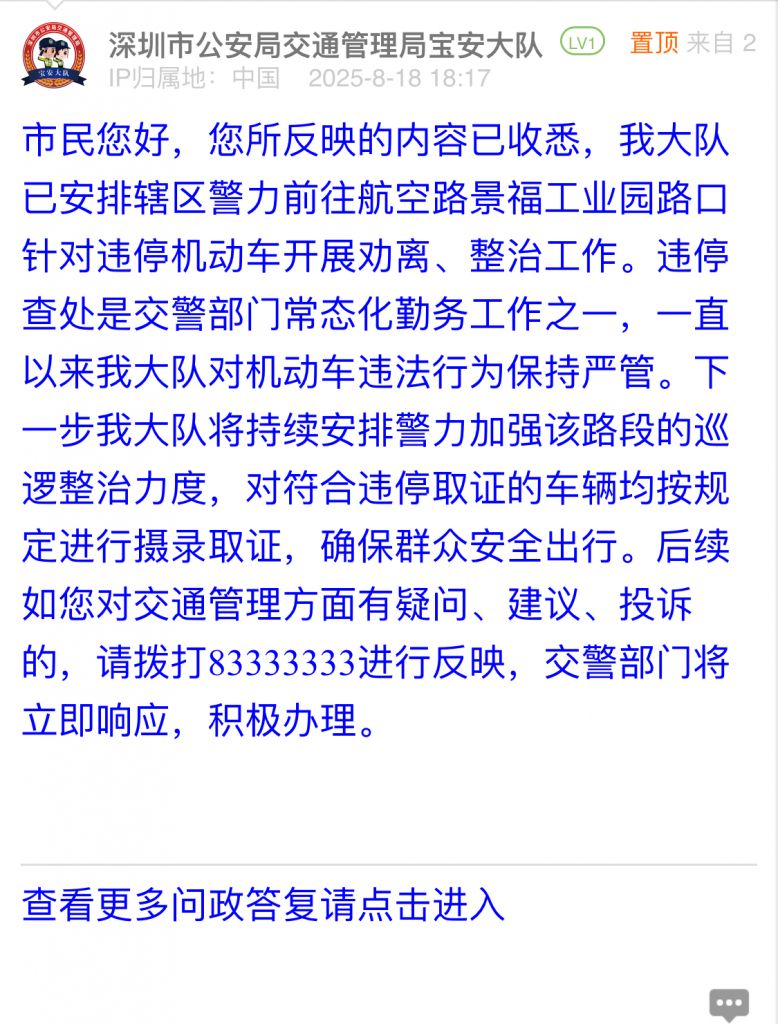 市民您好,您所反映的內(nèi)容已收悉,我大隊(duì)已安排轄區(qū)警力前往航空路景福工業(yè)園路口針對(duì)違停機(jī)動(dòng)車開展勸離、整治工作。違停查處是交警部門常態(tài)化勤務(wù)工作之一,一直以來(lái)我大隊(duì)對(duì)機(jī)動(dòng)車違法行為保持嚴(yán)管。下一步我大隊(duì)將持續(xù)安排警力加強(qiáng)該路段的巡邏整治力度,對(duì)符合違停取證的車輛均按規(guī)定進(jìn)行攝錄取證,確保群眾安全出行。后續(xù)如您對(duì)交通管理方面有疑問(wèn)、建議、投訴的,請(qǐng)撥打83333333進(jìn)行反映,交警部門將立即響應(yīng),積極辦理。