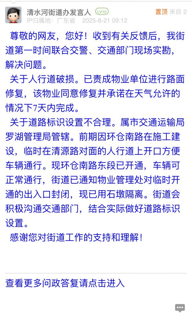 關(guān)于道路標(biāo)識(shí)設(shè)置不合理。屬市交通運(yùn)輸局羅湖管理局管轄。前期因環(huán)倉(cāng)南路在施工建設(shè),臨時(shí)在清源路對(duì)面的人行道上開口方便車輛通行。現(xiàn)環(huán)倉(cāng)南路東段已開通,車輛可正常通行,街道已通知物業(yè)管理處對(duì)臨時(shí)開通的出入口封閉,現(xiàn)已用石墩隔離。街道會(huì)積極溝通交通部門,結(jié)合實(shí)際做好道路標(biāo)識(shí)設(shè)置。