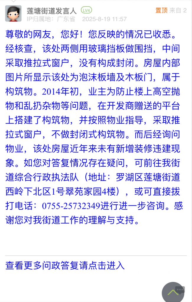 尊敬的網(wǎng)友,您好!您反映的情況已收悉。經(jīng)核查,該處兩側(cè)用玻璃擋板做圍擋,中間采取推拉式窗戶,沒(méi)有構(gòu)成封閉。房屋內(nèi)部圖片所顯示該處為泡沫板墻及木板門,屬于構(gòu)筑物。2014年初,業(yè)主為防止樓上高空拋物和亂扔雜物等問(wèn)題,在開發(fā)商贈(zèng)送的平臺(tái)上搭建了構(gòu)筑物,并按照物業(yè)指導(dǎo),采取推拉式窗戶,不做封閉式構(gòu)筑物。而后經(jīng)詢問(wèn)物業(yè),該處房屋近年來(lái)未有新增裝修違建現(xiàn)象。如您對(duì)答復(fù)情況存在疑問(wèn),可前往我街道綜合行政執(zhí)法隊(duì)(地址:羅湖區(qū)蓮塘街道西嶺下北區(qū)1號(hào)翠苑家園4樓),或可直接撥打電話:0755-25732349進(jìn)行進(jìn)一步咨詢。感謝您對(duì)我街道工作的理解與支持。