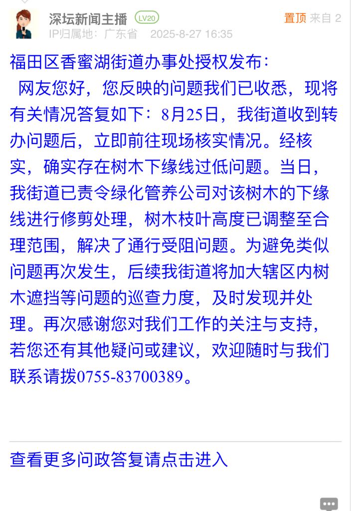 網(wǎng)友您好,您反映的問(wèn)題我們已收悉,現(xiàn)將有關(guān)情況答復(fù)如下:8月25日,我街道收到轉(zhuǎn)辦問(wèn)題后,立即前往現(xiàn)場(chǎng)核實(shí)情況。經(jīng)核實(shí),確實(shí)存在樹木下緣線過(guò)低問(wèn)題。當(dāng)日,我街道已責(zé)令綠化管養(yǎng)公司對(duì)該樹木的下緣線進(jìn)行修剪處理,樹木枝葉高度已調(diào)整至合理范圍,解決了通行受阻問(wèn)題。為避免類似問(wèn)題再次發(fā)生,后續(xù)我街道將加大轄區(qū)內(nèi)樹木遮擋等問(wèn)題的巡查力度,及時(shí)發(fā)現(xiàn)并處理。再次感謝您對(duì)我們工作的關(guān)注與支持,若您還有其他疑問(wèn)或建議,歡迎隨時(shí)與我們聯(lián)系請(qǐng)撥0755-83700389。