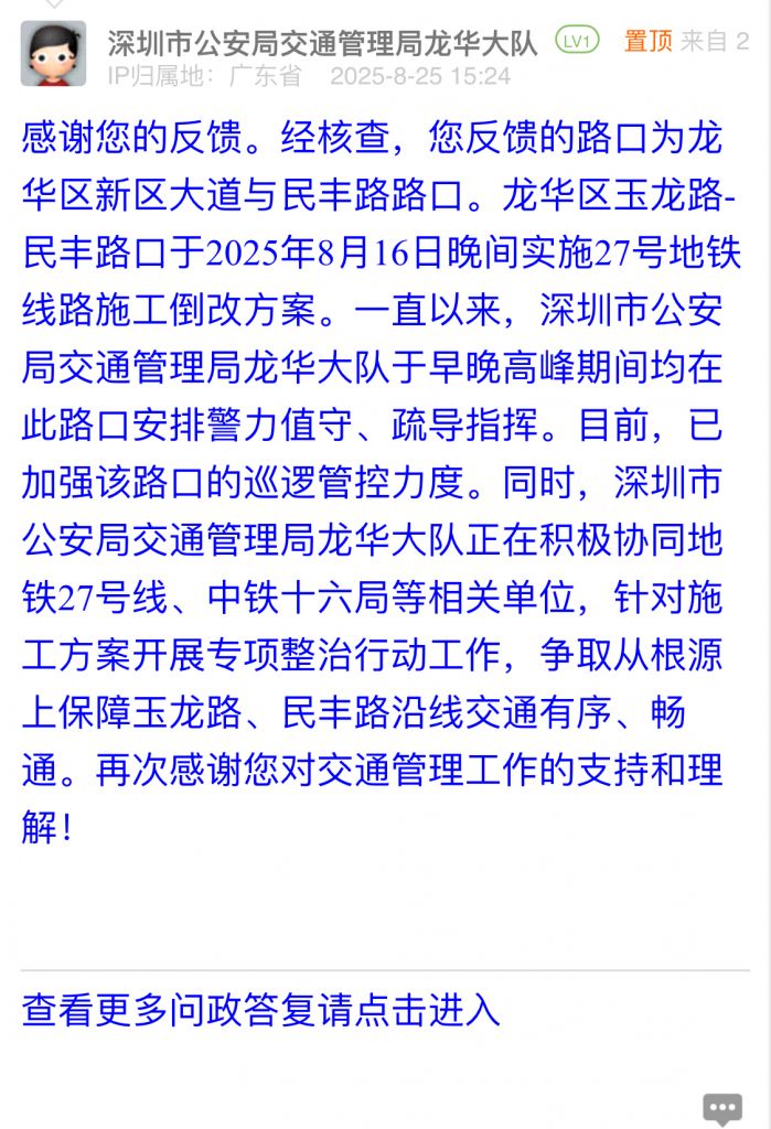 感謝您的反饋。經(jīng)核查,您反饋的路口為龍華區(qū)新區(qū)大道與民豐路路口。龍華區(qū)玉龍路-民豐路口于2025年8月16日晚間實(shí)施27號(hào)地鐵線路施工倒改方案。一直以來(lái),深圳市公安局交通管理局龍華大隊(duì)于早晚高峰期間均在此路口安排警力值守、疏導(dǎo)指揮。目前,已加強(qiáng)該路口的巡邏管控力度。同時(shí),深圳市公安局交通管理局龍華大隊(duì)正在積極協(xié)同地鐵27號(hào)線、中鐵十六局等相關(guān)單位,針對(duì)施工方案開展專項(xiàng)整治行動(dòng)工作,爭(zhēng)取從根源上保障玉龍路、民豐路沿線交通有序、暢通。再次感謝您對(duì)交通管理工作的支持和理解!