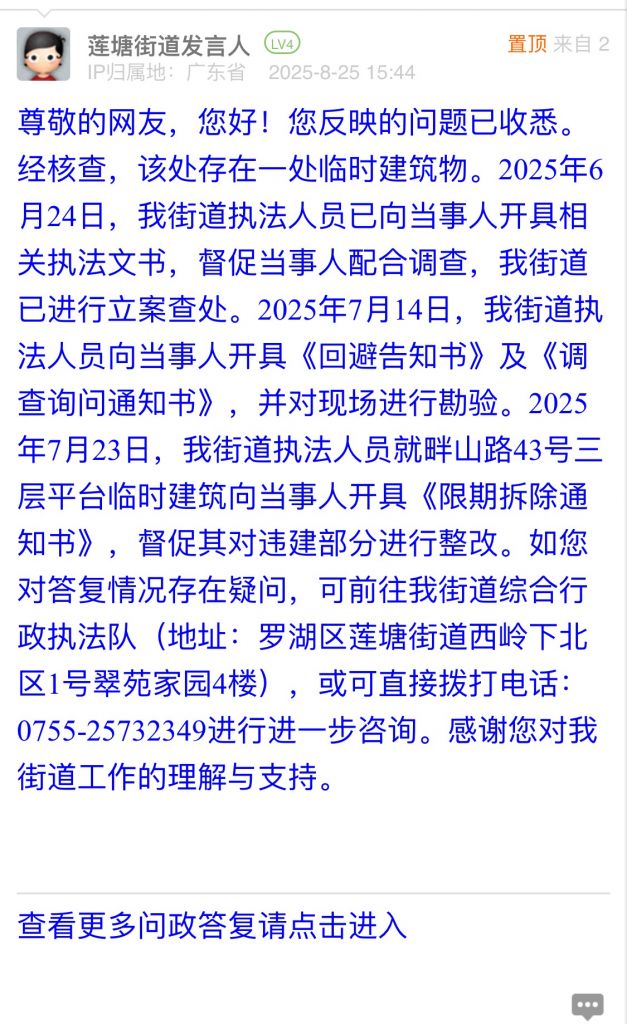 尊敬的網(wǎng)友,您好!您反映的問(wèn)題已收悉。經(jīng)核查,該處存在一處臨時(shí)建筑物。2025年6月24日,我街道執(zhí)法人員已向當(dāng)事人開具相關(guān)執(zhí)法文書,督促當(dāng)事人配合調(diào)查,我街道已進(jìn)行立案查處。2025年7月14日,我街道執(zhí)法人員向當(dāng)事人開具《回避告知書》及《調(diào)查詢問(wèn)通知書》,并對(duì)現(xiàn)場(chǎng)進(jìn)行勘驗(yàn)。2025年7月23日,我街道執(zhí)法人員就畔山路43號(hào)三層平臺(tái)臨時(shí)建筑向當(dāng)事人開具《限期拆除通知書》,督促其對(duì)違建部分進(jìn)行整改。如您對(duì)答復(fù)情況存在疑問(wèn),可前往我街道綜合行政執(zhí)法隊(duì)(地址:羅湖區(qū)蓮塘街道西嶺下北區(qū)1號(hào)翠苑家園4樓),或可直接撥打電話:0755-25732349進(jìn)行進(jìn)一步咨詢。感謝您對(duì)我街道工作的理解與支持。