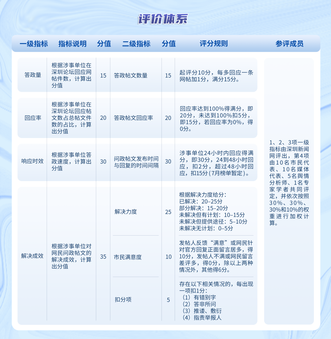 “問政深圳紅黑榜”具有科學(xué)、合理、完備的綜合評價體系,能夠綜合評估深圳各級黨政機關(guān)和公共企事業(yè)單位的答政情況。