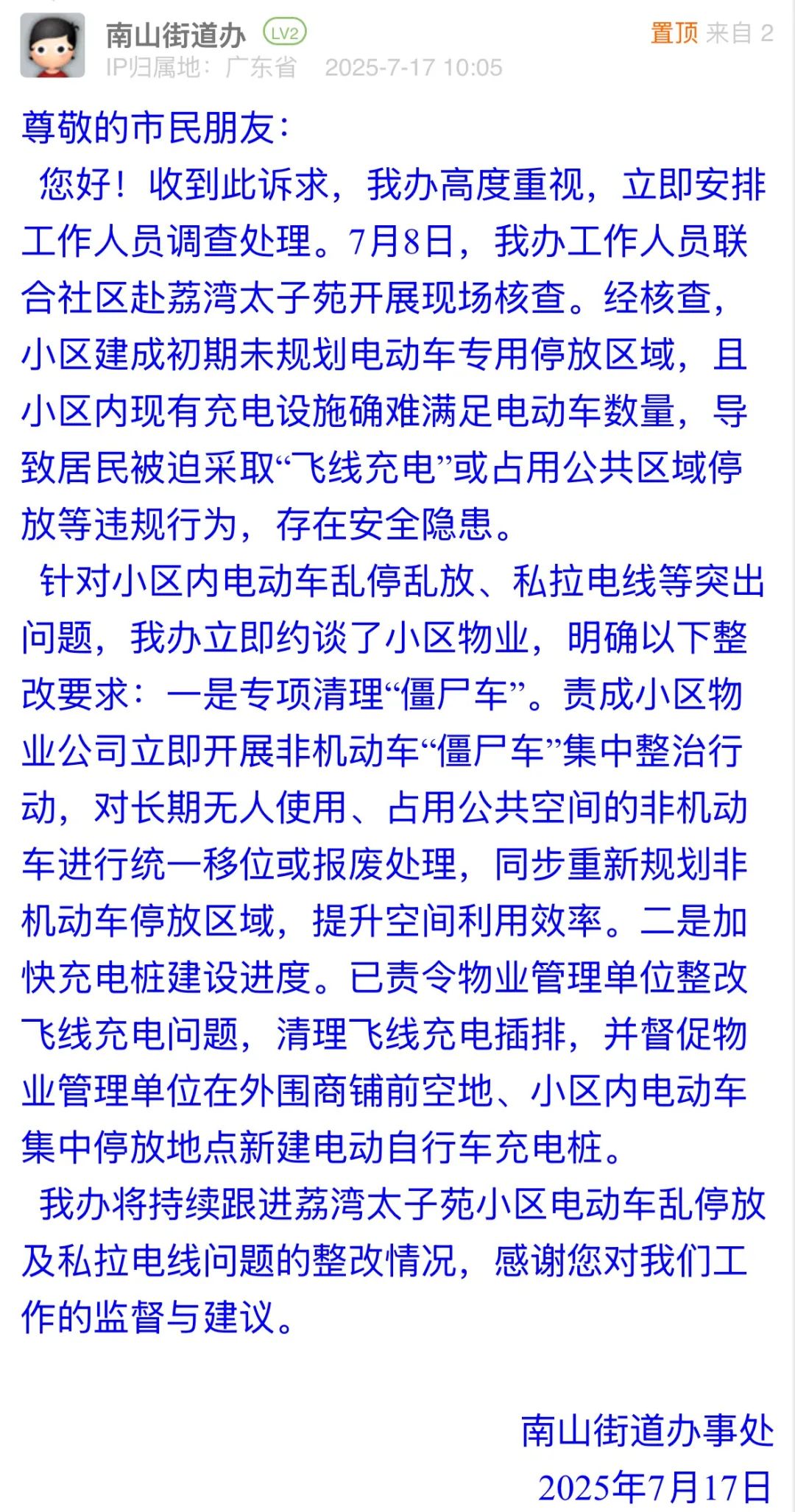 針對小區(qū)內(nèi)電動車亂停放、私拉電線等存在安全隱患的行為,南山街道辦接訴后迅速聯(lián)合社區(qū)核查,說明了歷史規(guī)劃不足的核心病因,通過約談物業(yè)推動整改,從“應(yīng)急響應(yīng)”到“系統(tǒng)治理”的務(wù)實舉措,回應(yīng)了市民對消防通道暢通、用電安全的關(guān)切,以“標(biāo)本兼治”的治理思路,為老舊小區(qū)電動車管理提供了可復(fù)制的解決方案。
