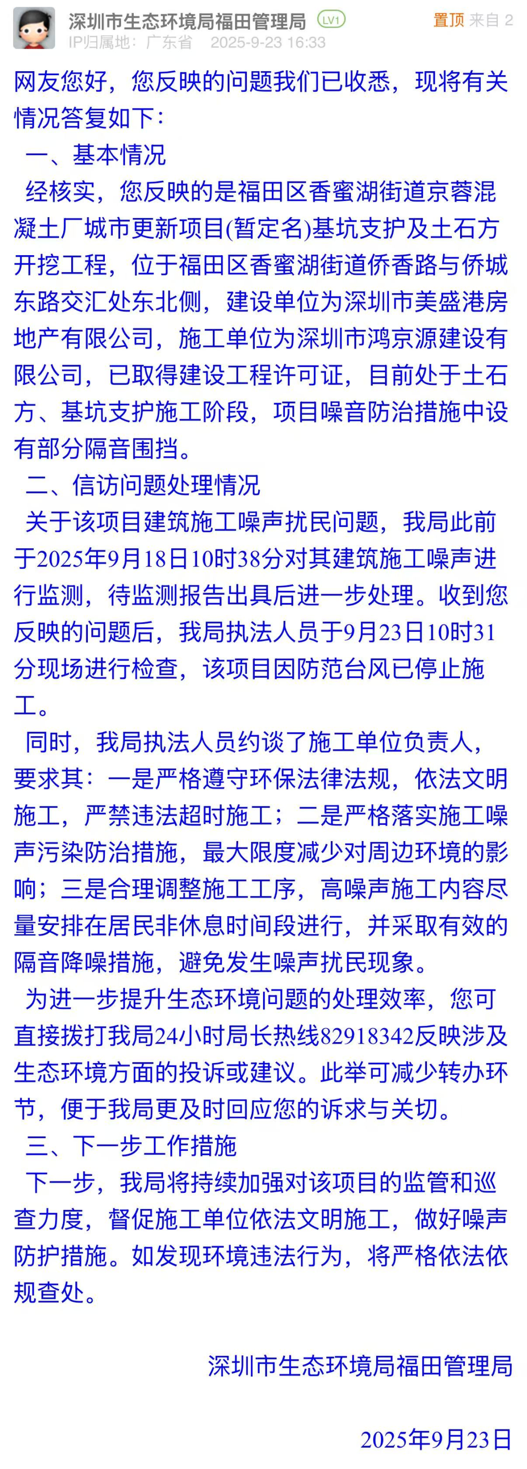 優(yōu)化建議:在訴求中,市民表示施工噪音可以忍耐,但希望“灰塵大”情況可以得到緩解,并附圖展示現(xiàn)場情況。市生態(tài)環(huán)境局福田管理局在回應(yīng)中,僅聚焦建筑施工噪聲,對“灰塵污染”只字未提,與市民訴求脫節(jié)。建議后續(xù)提高訴求匹配度,用務(wù)實的態(tài)度回應(yīng)市民對居住環(huán)境、城市建設(shè)的關(guān)切,避免因回應(yīng)不完整引發(fā)新的治理信任問題。