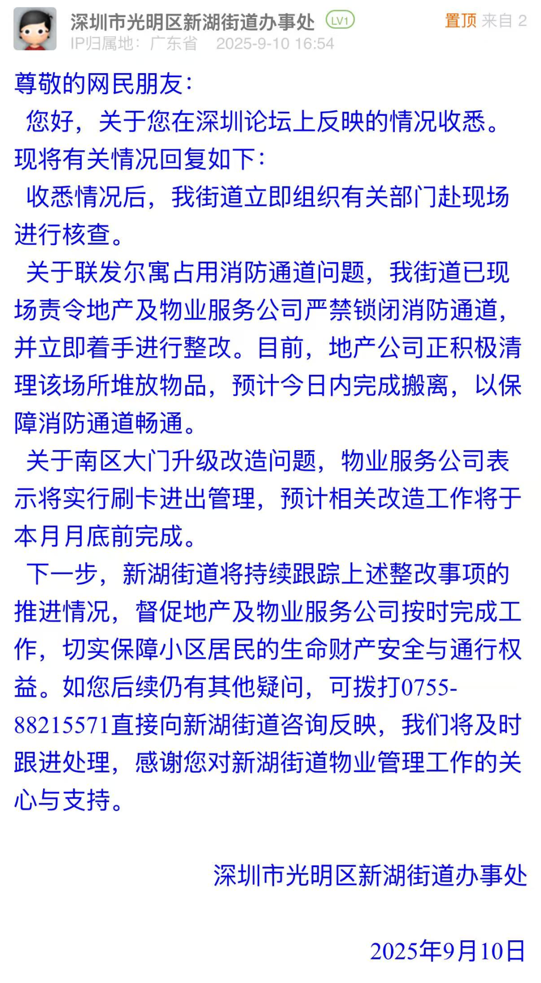 案例點評:消防通道是保障居民生命安全的“生命通道”,在突發(fā)狀況下肩負(fù)著關(guān)鍵作用。針對小區(qū)消防通道被違規(guī)占用這一安全隱患,新湖街道辦第一時間責(zé)令責(zé)任方整改,高效推動障礙物清理,暢通消防通道。對于市民小區(qū)大門升級改造的訴求,街道辦的回應(yīng)明確了刷卡管理改造的時間節(jié)點,以實際行動推動安全隱患消除、提升小區(qū)管理品質(zhì),充分彰顯了基層治理的責(zé)任擔(dān)當(dāng)與務(wù)實智慧。