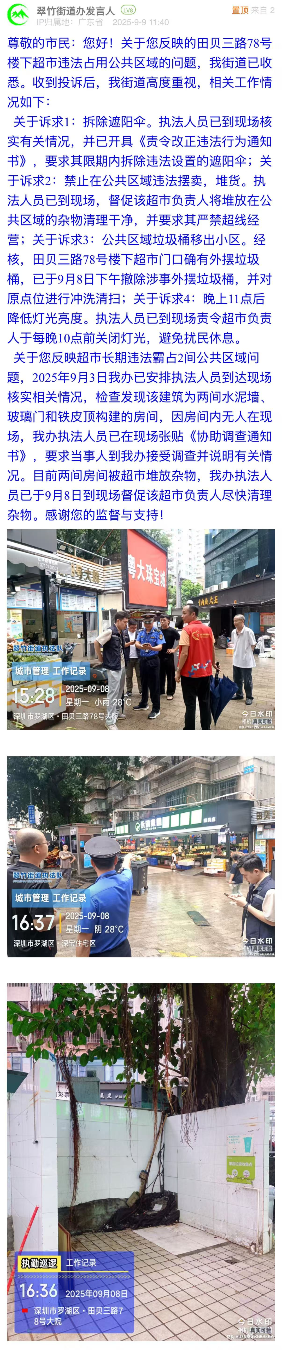 案例點評:本案例中,翠竹街道辦立足市民訴求,對違規(guī)搭建遮陽傘、占用公共區(qū)域、違規(guī)堆放垃圾、店面燈牌亮度過高這四個問題,街道均做到快速響應(yīng),并以圖片展示治理效果?;貞?yīng)既體現(xiàn)了基層執(zhí)法的規(guī)范性與時效性,又展現(xiàn)了對民生細(xì)節(jié)的關(guān)注力,踐行了“小事不小辦、事事有回音”的理念,為同類民生訴求的解決提供了可借鑒范式。