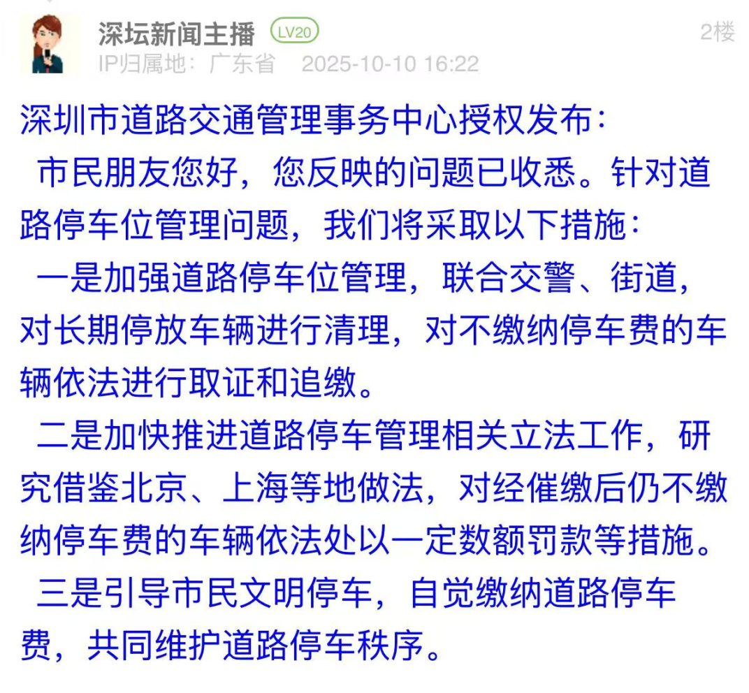 優(yōu)化建議:市民在帖文中反映,其此前的投訴件被標(biāo)記為“辦結(jié)”,但霸位車輛依舊未被移走,現(xiàn)場問題未解決,質(zhì)疑相關(guān)部門執(zhí)行力不足。對于市民的再次投訴,深圳市道路交通管理事務(wù)中心的回應(yīng)存在公式化、未切實回應(yīng)市民核心關(guān)切的問題,僅以“加強管理”“推進(jìn)立法”“引導(dǎo)文明停車”等回復(fù),難以消除公眾對治理執(zhí)行力的疑慮。建議后續(xù)強化回應(yīng)針對性,具體問題具體答復(fù),如公開執(zhí)法流程、提供處置證據(jù)等,以務(wù)實態(tài)度回應(yīng)市民監(jiān)督,提升治理公信力。