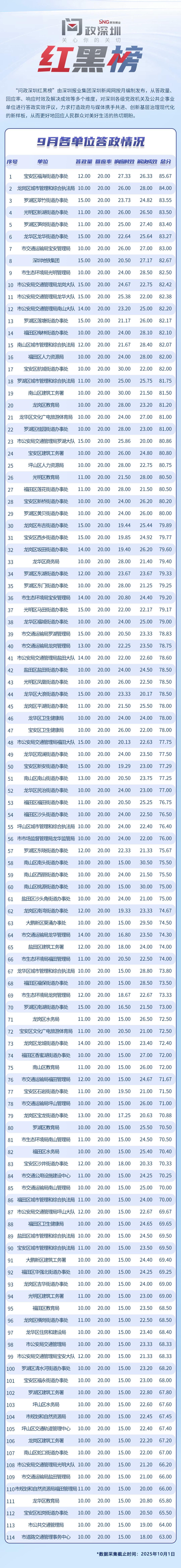 為探尋媒體如何精準(zhǔn)賦能基層治理現(xiàn)代化的“深圳路徑”,深圳報業(yè)集團(tuán)正式掛牌成立“問政深圳”工作室,旨在進(jìn)一步推動網(wǎng)絡(luò)問政工作的高效開展。為確保相關(guān)工作更加契合實際需求,自上期起,深圳報業(yè)集團(tuán)深圳新聞網(wǎng)按照“最快速度辦結(jié)”的總體要求,將原有月度榜單創(chuàng)新升級為“問政深圳紅黑榜”,并對評分體系進(jìn)行了細(xì)致優(yōu)化。該榜單從答政量、回應(yīng)率、響應(yīng)時效及解決成效等多個維度,對深圳各級黨政機(jī)關(guān)及公共企事業(yè)單位進(jìn)行答政實效評議,力求打造政府與媒體攜手共進(jìn)、創(chuàng)新基層治理現(xiàn)代化的新樣板,從而更好地回應(yīng)人民群眾對美好生活的熱切期盼。