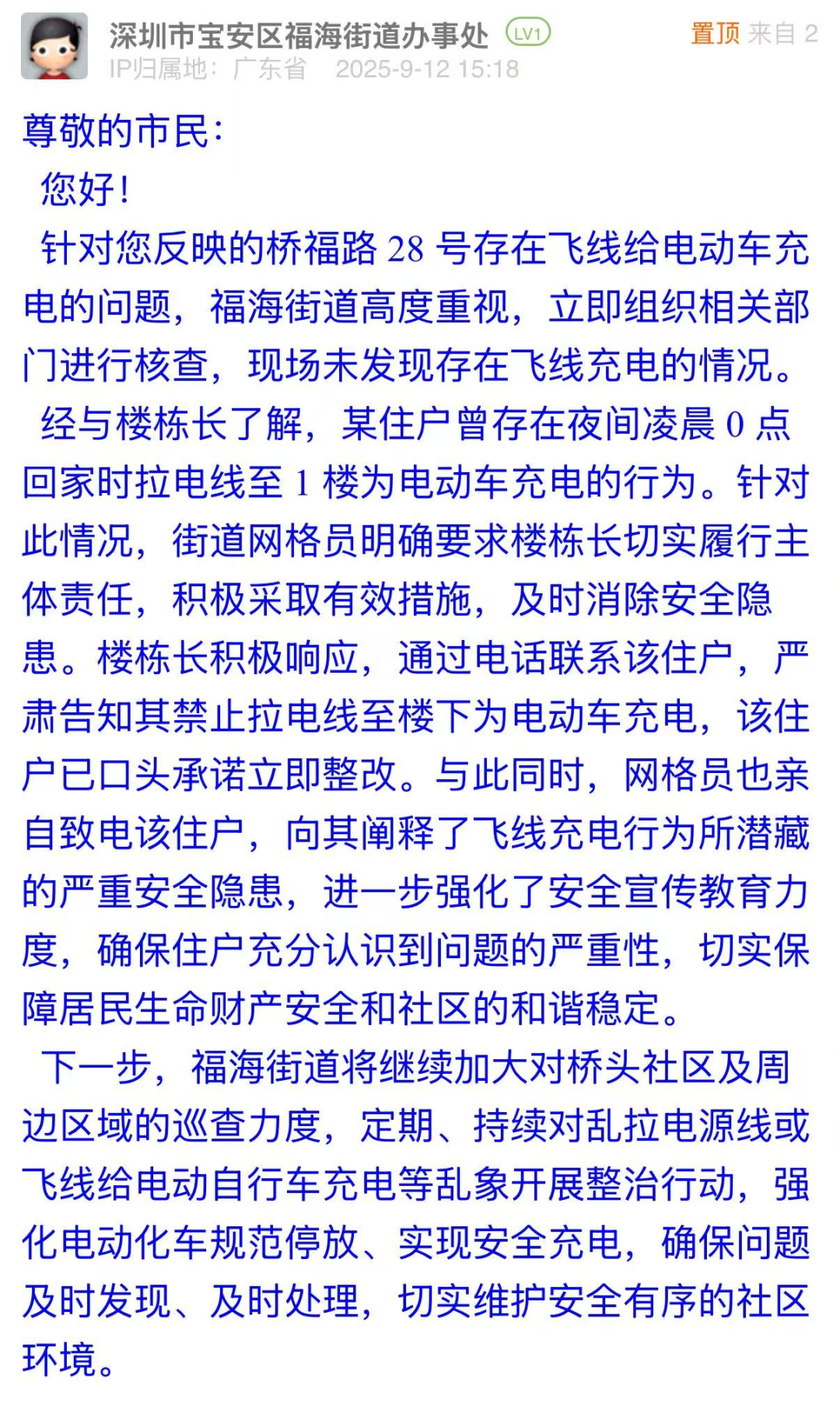 案例點評:福海街道辦對電動車“飛線充電”問題展現(xiàn)出快速響應(yīng)、權(quán)責(zé)明晰的治理態(tài)度,第一時間組織核查,既明確主體責(zé)任、嚴(yán)令整改,又細(xì)致開展安全教育,讓住戶充分認(rèn)知“飛線充電”的嚴(yán)重危害,體現(xiàn)執(zhí)法和普法的雙重?fù)?dān)當(dāng)?;貞?yīng)中,街道辦還表示將強化巡查力度、開展整治行動,建立長效治理機(jī)制,維護(hù)社區(qū)安全秩序,彰顯了基層治理中“問題導(dǎo)向、標(biāo)本兼治”的治理邏輯。
