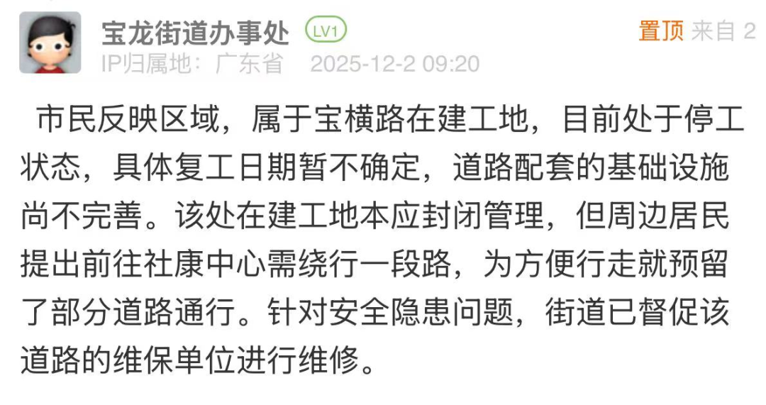 優(yōu)化建議:針對(duì)市民反映的道路在建工地預(yù)留道路路燈暗淡、路磚碎裂等問題,帖文回應(yīng)存在“解釋多、舉措少”的短板,未能化解群眾多次投訴無果的不滿。同時(shí),“復(fù)工日期暫不確定”的表述易引發(fā)市民的疑惑與不滿,后續(xù)有市民在評(píng)論區(qū)反饋該道路仍未啟動(dòng)維修工作,建議責(zé)任單位主動(dòng)協(xié)同項(xiàng)目建設(shè)、施工等責(zé)任主體,明確給出復(fù)工的預(yù)估時(shí)間或階段性處置方案及臨時(shí)性保障措施,推動(dòng)問題解決。