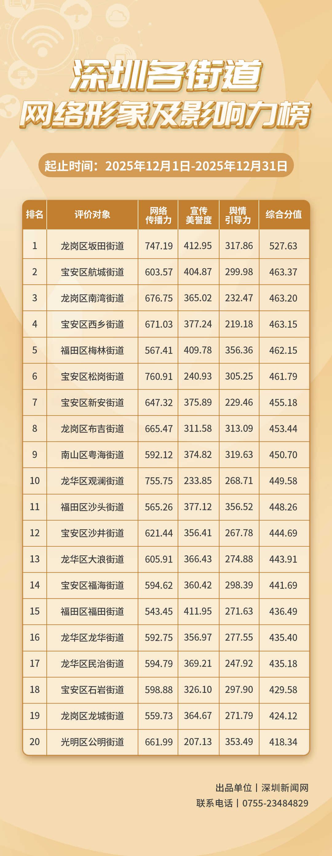 2025年12月,共有20個街道登上《深圳各街道網(wǎng)絡(luò)形象及影響力榜》,分別是:龍崗區(qū)坂田街道、寶安區(qū)航城街道、龍崗區(qū)南灣街道、寶安區(qū)西鄉(xiāng)街道、福田區(qū)梅林街道、寶安區(qū)松崗街道、寶安區(qū)新安街道、龍崗區(qū)布吉街道、南山區(qū)粵海街道、龍華區(qū)觀瀾街道、福田區(qū)沙頭街道、寶安區(qū)沙井街道、龍華區(qū)大浪街道、寶安區(qū)福海街道、福田區(qū)福田街道、龍華區(qū)龍華街道、龍華區(qū)民治街道、寶安區(qū)石巖街道、龍崗區(qū)龍城街道、光明區(qū)公明街道。