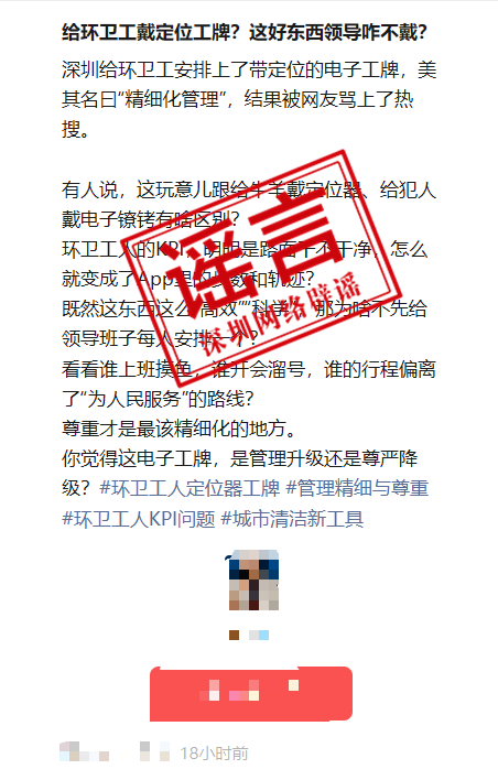 記者梳理發(fā)現(xiàn),2024年6月,也曾出現(xiàn)“深圳環(huán)衛(wèi)工人佩戴的定位手環(huán)停留15秒后將自動報警”的謠言,此前深圳市城市管理和綜合執(zhí)法局已辟謠。